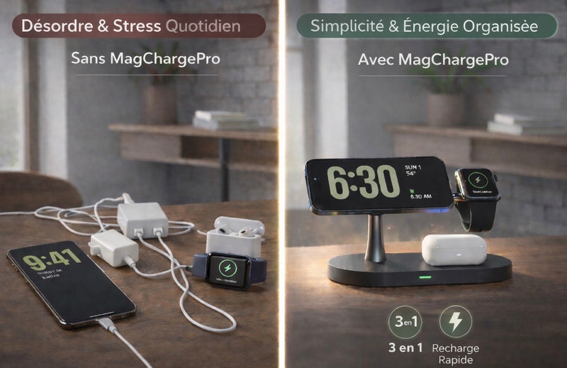 Transformez votre espace avec notre station 3-en-1. Charge magnétique rapide, design premium, organisation ultime pour votre écosystème Apple.